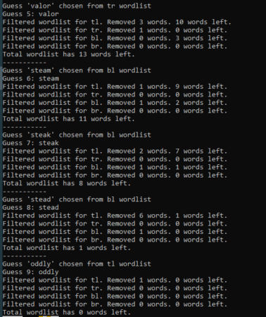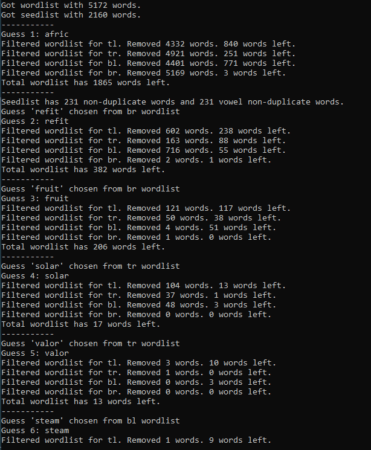 QuordleBot outputs some interesting information after each guess. Under the hood, it keeps separate wordlists for each quadrant and synthesizes them into a master wordlist. After each guess, it displays how many words were removed from each quadrant’s wordlist and how many are left. You can start to see interesting patterns as you run QuordleBot a few times. The first seed word is very important, for example.
