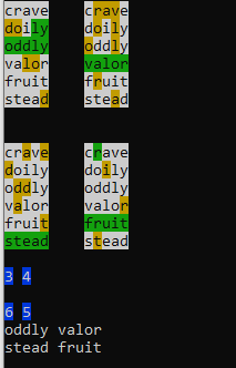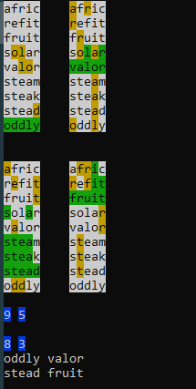 This process has replaced random searching in every single decision branch except for one. Guess 1 is still random. This is due to performance limitations. Even guess 2 is rather slow (on the order of a minute) when the first guess wasn’t particularly good. If, for example, there were 200 non-duplicate seedwords left after guess 1 and 1000 total words left in the wordlist, impact scoring all of the non-duplicate seedwords will result in the code running in a loop 200 (non-dup seeds)*3^5(number of orderings)*5(number letters that have to be compared)*1000(words to be compared to) = 243,000,000 times, which takes a bit of time. By the time you get to guess 3, the sizes of the lists you’re working with are small enough that it usually takes fractions of a second to calculate the impact scores (of course, right after writing this, I did a run for fun and it hung on guess 3 for reasons not worth explaining).