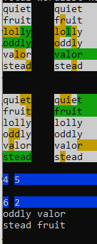 Version 1.2 tackled the “unable to solve” issue. I established a threshold (that can be tuned) where QB can override the random selection from the master list (or seedlist) to instead randomly select from a certain quadrant’s list. You’ll see that behavior in most of the guesses above where it says “chosen from tr [top-right] wordlist” or similar. The threshold can actually be tuned separately for a few different conditions. For guess 2, the threshold is much lower than for guesses 3+ so that we only override the default behavior if there’s a high likelihood of getting a word in 2. At this point, QB was an average quordler. Most scores were at or slightly above the Tundra line, but the teens were popping up on occasion and chumping had become blessedly uncommon. However, I did notice a glaring issue. When I’m using seed words in my first two guesses, I make an attempt to have them be as different of words as possible. QB wasn’t doing that. It was just randomly pulling the next word from the seedlist.