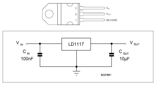 Vin is the 4.7v from the battery, it goes into Pin 3, but has a ten microFarad capacitor connecting it to ground. The Vout is the 3.3v going to the rest of the decide and comes from Pin 2. It also has a 10 microFarad capacitor connecting it to ground. Ground gets connected to Pin 1.
