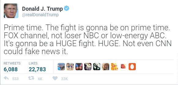 “No, no, no. Sean, no. No, Sean. Listen to me. LISTEN. TO. ME. The fight is going to happen no matter what,” Donald said, “I’m just giving you guys the opportunity to air it. In prime time. Yes, prime time. 8pm, Sean. Right after Wheel of Fortune.”
