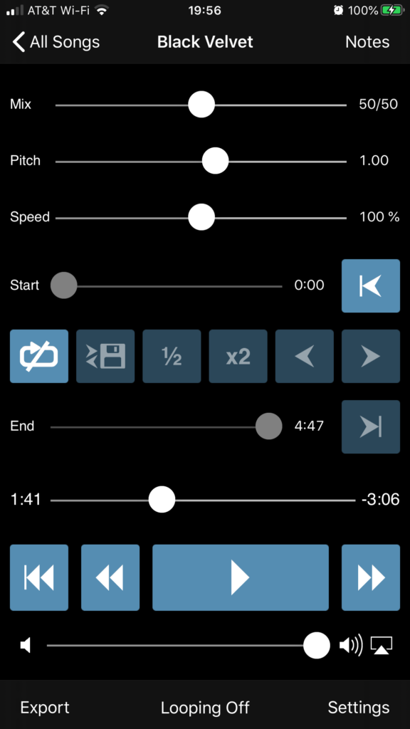 Now we’re pushing it, but I want to introduce you to a new thang. In the recording this song is played with the guitar tuned down a half step, meaning the strings are tuned to Eb, Ab, Db, Gb, Bb & Eb. But you don’t have to do that! Download an app onto your phone called Amazing Slow Downer. Import Black Velvet into your phone’s songs, then select it in your new app. There’s a slide bar called Pitch that adjusts in half steps (called semitones in the app). Move the slider up to 1.00 and it’ll modulate the song so that you can play along with your guitar remaining in standard EADGBE tuning. Trust me. The app screen should look like this…