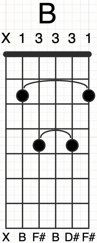Black Velvet chart. Ignore the sus4 on all chords that have it, and just play the root’s major chord (e.g. play B instead of Bsus4) and it’ll work just fine (I know I said otherwise in the previous article, but, yeah.). Likewise you can ignore the 7 extensions. Play the F voicing as I’ve got it on the left above. The tricky chord in this one is the B, as it’s easiest played as a barre chord. If the high F# note doesn’t ring out cuz your fret hand ring finger is muting it, fuhgeddaboudit, that’s actually normal. The B barre chord…