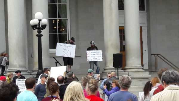I noted some guys carrying signs referencing Article X of the New Hampshire Constitution.  I always thought this was a silly provision because what government is going to recognize a right to armed rebellion?  If shooting starts, the government is going to say, “Oh, right, Article X says we have to allow this.  We’re just going to roll over and die.”  Sure, and I have a bridge to sell you.
