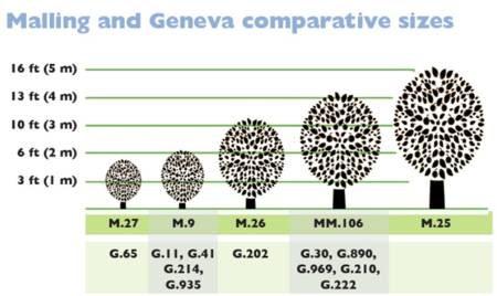 Apple trees grafted on to dwarfing rootstocks can be planted in small yards and can be managed (pruned, sprayed, and picked) from the ground or a short step ladder. Several trees can be grown in the space that a single full-sized tree requires. This means that multiple cultivars can be grown in a limited area to ensure the trees have pollination partners. On the down side, dwarfing rootstocks tend to produce small root systems. Under a heavy load of apples, the trees can actually uproot and fall over. So many varieties of dwarfing rootstocks require the tree to be permanently attached to wooden or metal posts to support the tree.