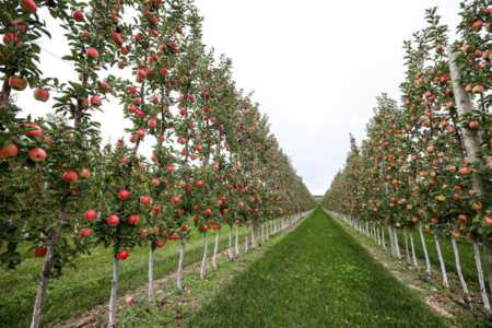 These orchards are planted on semi-dwarfing rootstock which will allow the trees to grow about 10 feet tall so the trees can be managed from a tall step ladder. The trees are planted very close together (2 to 4 feet apart), and are arranged in rows with wire trellises providing support. The rows are far enough apart for a tractor to drive between the rows. The trees are pruned to give many short, stubby branches were all the apples will grow. There is very little green growth on the trees.