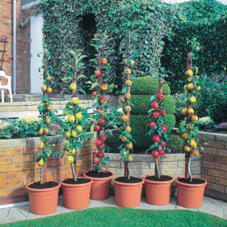 The same technique can be used in the backyard orchard. Using dwarfing rootstock (which produces a 6- to 9-foot-tall tree) trees can be planted in the ground a few feet apart and tied to a permanent stake for support. Using very-dwarfing rootstock (which produces a 4- to 6-foot-tall tree) trees can be planted in pots and moved around for to where ever is most convenient.
