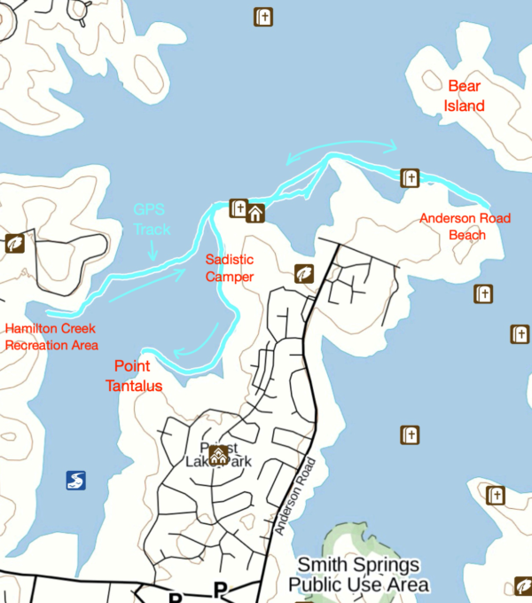 This trip was set up as a Meetup event, but no one else RSVP’d. Had they, the original plan was to take a short trip from our launch, the Hamilton Creek Recreation Area, across the creek’s greater cove, to anchor off the opposite shore, the western side of the Anderson Road peninsula, have some beverages and snacks while enjoying the sights.