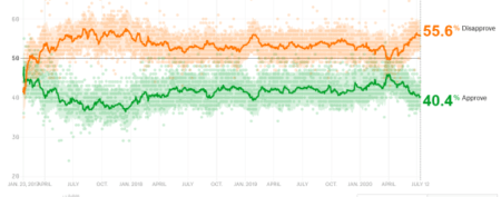 Meanwhile, do we think that the Fact of Trump™ has been even more exciting and attractive as the prospect of Trump? Everyone is entrenched: Trump’s approval rate is stunningly flat; it started bad but has gone nowhere regardless of missteps, triumphs, claims, rebuttals, or the virus. Trump plods along at 42% approval with 53% disapproval; we don’t know how many of these folk are likely voters, but it doesn’t matter: the numbers refuse to move. Trump’s core is resolute . . . as are his detractors . . . unless you believe that the last three months’ figures (a drop to 40% from 45) are meaningful reflections of something or just noise as he continues to bob around in his normal altitude.