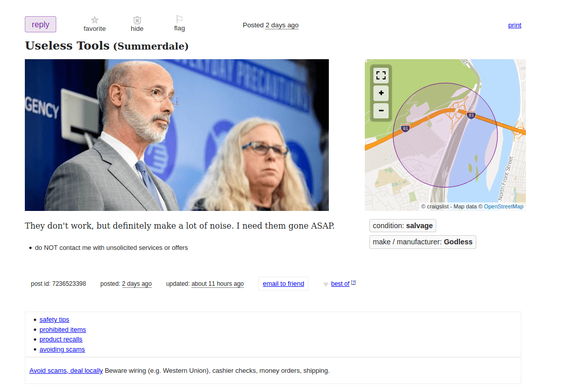 Please remember our friends and family in Pennsylvania. They need help getting rid of some useless tools. I took a screenshot of the Craig’s List ad in case it gets disappeared.