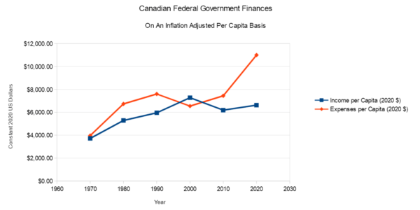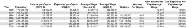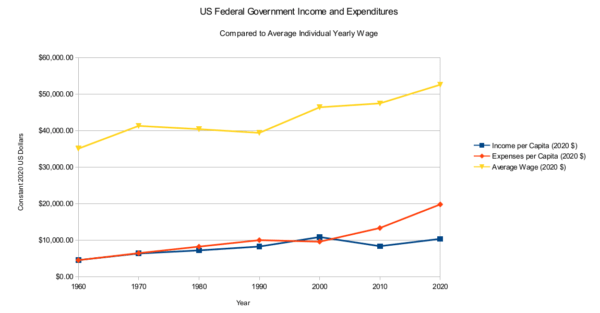 The remarkable thing here is that wages have grown considerably in constant dollars, yet nevertheless government income and expenditures have grown even faster. Per capita government income has grown from 13% of the average salary in 1960 to 20% of the average salary in 2020, despite the fact that the average salary itself increased by $17,500 in constant dollars over the same time frame. And, as should be no surprise given the fiscal irresponsibility discussed previously, government spending has ballooned from 13% to 37% of the average salary in the same time frame. It would appear that the government’s appetite is insatiable.