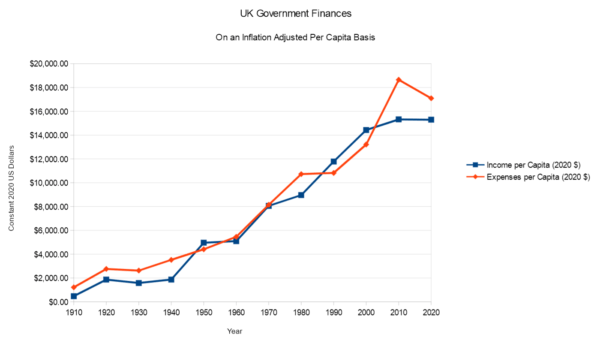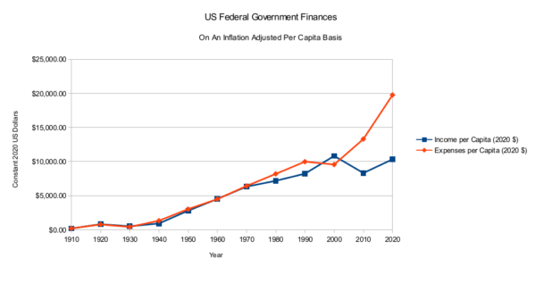 The second thing that sticks out from the data is the departure from fiscal responsibility. While the government has regularly run deficits, these were typically small until the 1980s, at which time the current pattern of spending beyond its means was established, to only briefly be corrected in the late 90s/early 2000s. Deficits went from being nothing ($5/person in 1910) and small ($221/person in 1950) to being significant ($1,023/person in 1980) and unsustainable ($9,441/person in 2020). As it is unlikely that the average citizen could afford an extra ten grand in taxes per year, this deficit spending will have to be corrected sooner or later. Hopefully fiscal sanity will prevail before a fiscal disaster, but I wouldn’t bet on it.