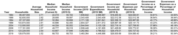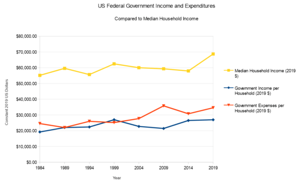 Considering things on a household basis does not improve the situation. In 2019 (the most recent year of household income available in my source) government income per household clocked in at 39% of median household income while government expenses per household exceeded 50% of the median household income. If the government were not running a deficit a very large number of households would be seeing more than half of their income consumed by the government, and even as it is the bill will come due one day, in some form or another, so I think it is fair to say that the government in the US places a heavy burden on its people. And this is only the federal government, most households must also contribute to their state and local governments as well.
