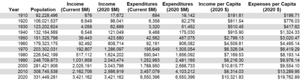 The first thing that sticks out to me from this data is the fact that government spending in per capita real terms has increased one hundred times over during the past 110 years. Whereas it took just under $200 per person (in 2020 dollars) to run the government in 1910, in 2020 it took just under $20,000. Whether this enormous increase in expenditures is justified or whether the individual tax-payer receives $20,000 worth of services from the government I will leave to the reader.