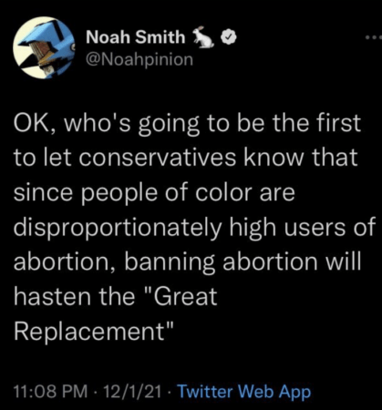 Re: that first tweet, I’ve also seen lefties complaining that banning abortion is (of course) white supremacy.