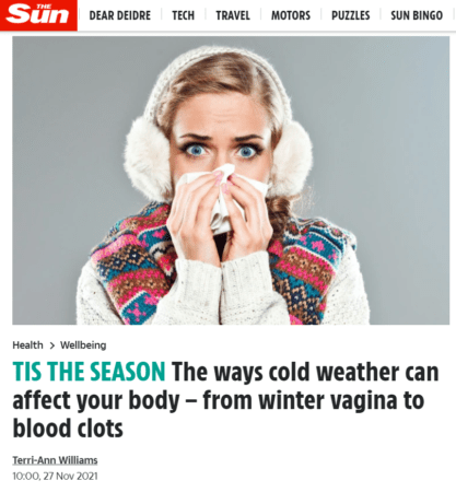 WINTER VAGINA: Symptoms of winter vagina include infections and Trish Coulton… We’re not sure what Trish Coulton is, but it sounds absolutely terrible. Take care of yourselves, vagina persons.