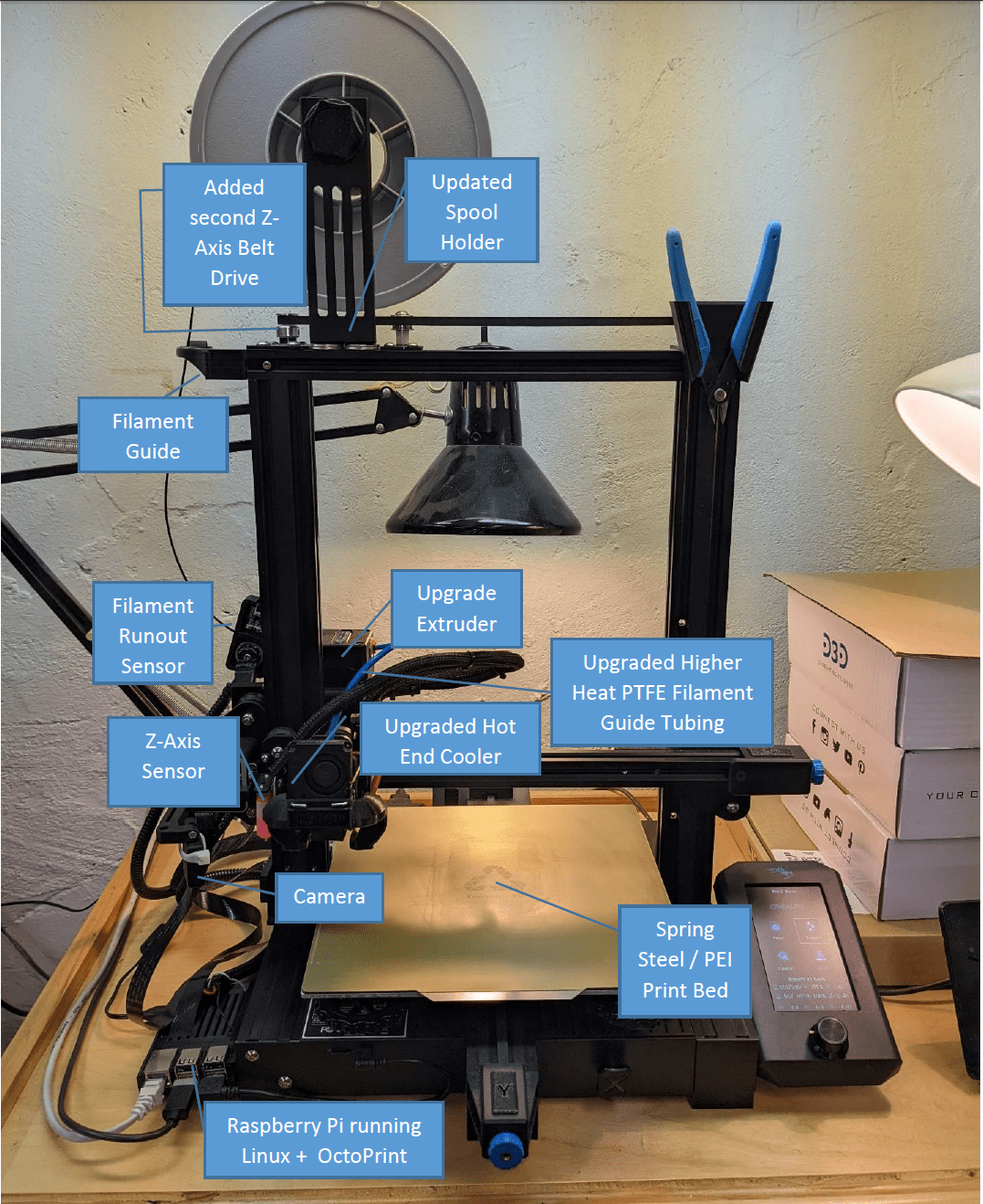 Below are most of  the major modifications.  The two most highly rated modifications are the BL Touch Z axis sensor and the spring steel and PEI printer bed.  The PEI allows the plastic to both stick to the bed well, while flexing the spring steel allows the piece to easily be removed.  The stock bed is tempered glass.  You get good adhesion, but parts are difficult to remove and the increased mass of the bed makes increases ringing artifacts that will show in the print.