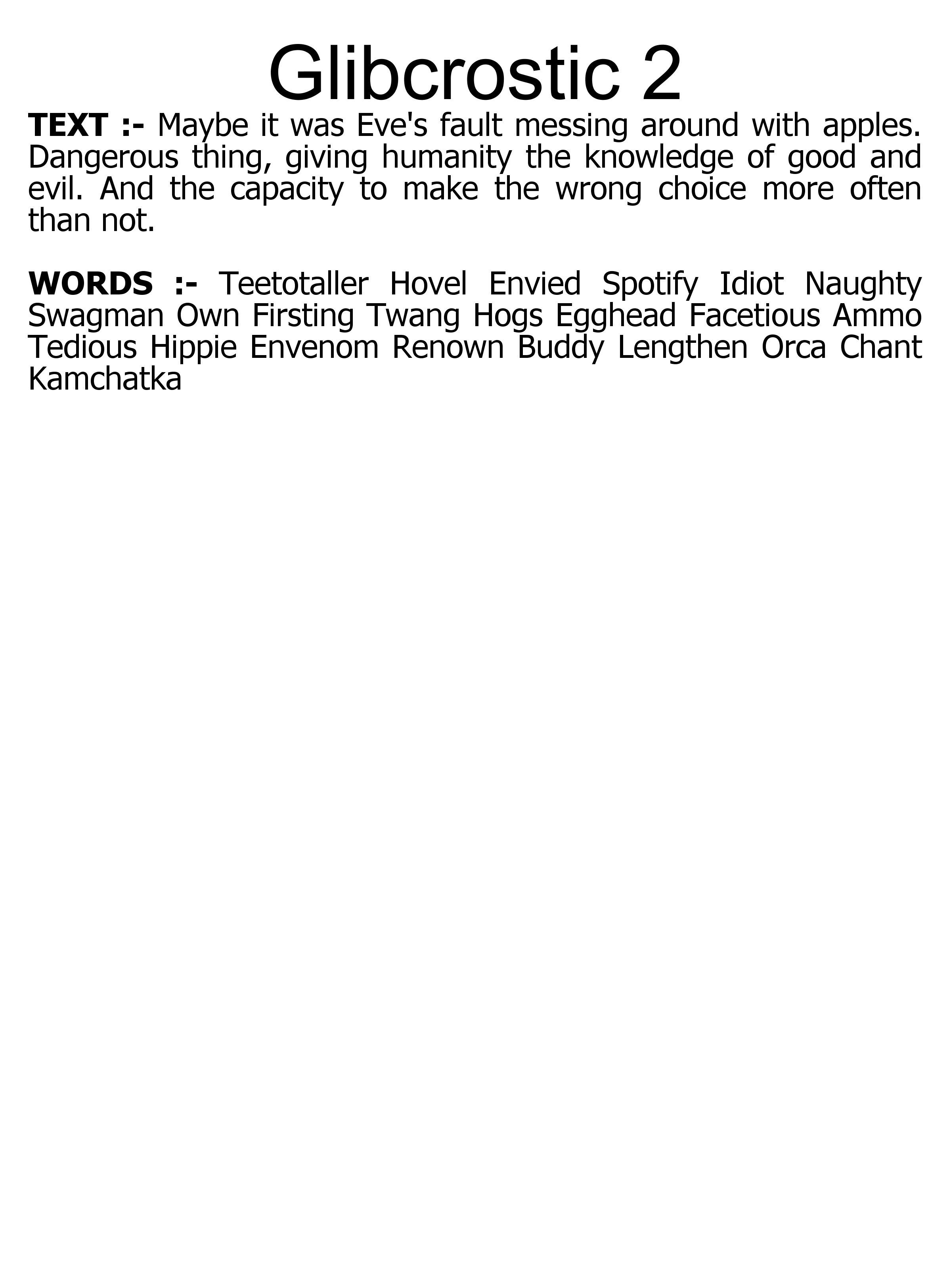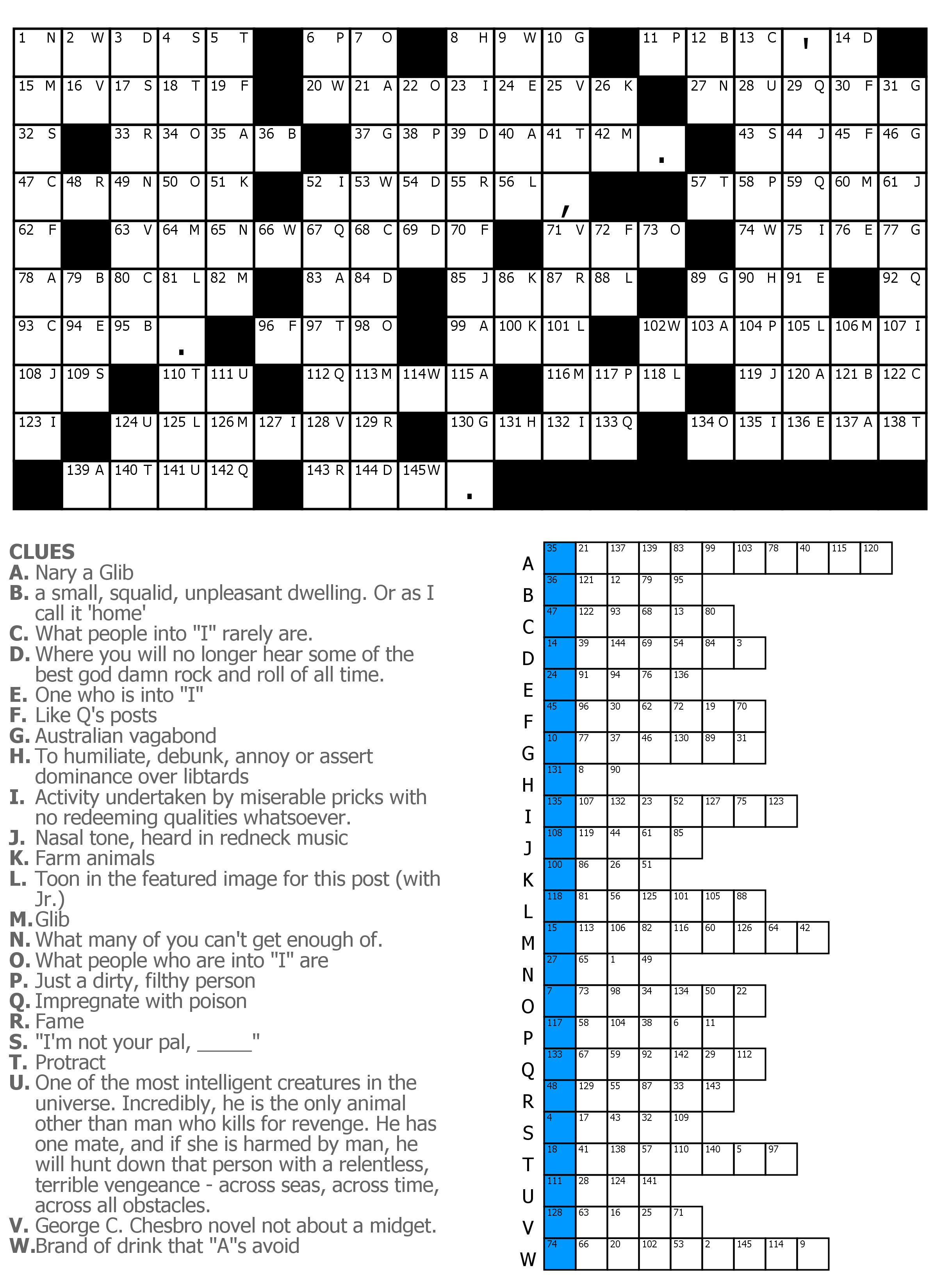 I found a program that makes making these much easier and TPTB are begging for content so I thought I’d try to make this a weekly feature, it will also motivate me to read a book a week, a goal I set years ago but rarely keep. This being the case I guess I will try and explain the puzzles a bit so some of the dimmer Glibs *cough Sloper cough* can maybe give it a try if they want. Today I’ll explain the clues that reference other clues, The clue C, para ejemplo, is “What people into “I” rarely are” The “I” in there isn’t a ‘me’ or ‘ego’ thing it is a stand in for the word that is the answer to clue “I” of the puzzle. Thus if the answer to “I” was “skiing” ( it’s not ) then clue C would be “What people into skiing rarely are” and Cue E would be “One who is into Skiing” and Clue O would be “What people who are into skiing are”. Get it? Good. Once again this is for entertainment only, please No Gambling.