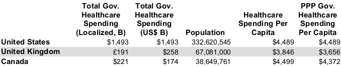 A fair comparison of government healthcare spending would consider the matter on a per-capita basis, so that is what I set out to find. To compare the spending of the United States with that of the United Kingdom and of Canada, I used reports of their total healthcare spending in 2021 (source US, source UK, source Canada), converted to dollars using a currency conversion for the date Dec 31, 2021 (source), and divided this by their population (source). Additionally, I also converted the local currency to Purchasing Power Parity (PPP) dollars using the ratios calculated by the OECD (source) and calculated this on a per capita basis as well. The results are in the table below.