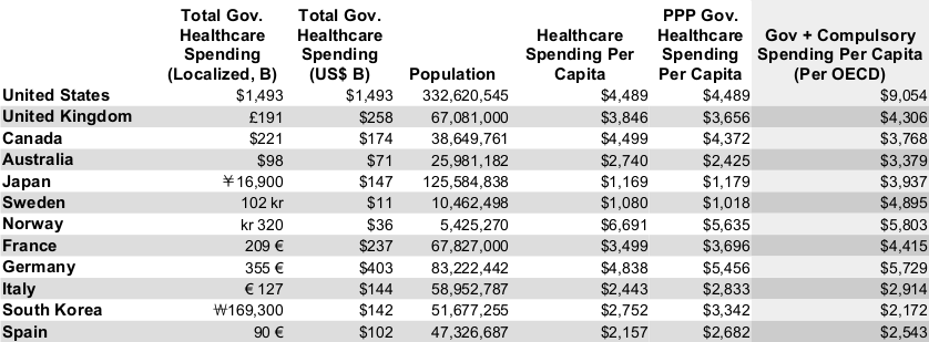 It is clear that the US government is one of the leading nations for government healthcare spending per-capita, and when the compulsory private spending is included (as per the OECD) there is no other nation which comes close. The US healthcare system is already very well funded by government mandate, so the only conclusion to be drawn, in my view, on the question of healthcare in the US is that no more money need be expended, but that any remaining issues can and should be resolved through other reforms.