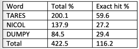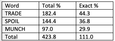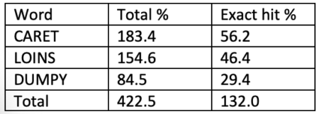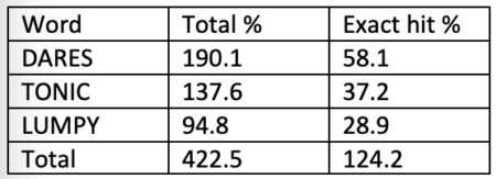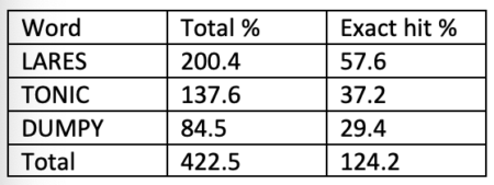 For a starting set of words, we can calculate the total percentage of hits and the frequency of exact hits. As an example, Tundra’s standard starting words give the following total percentages and exact hits: