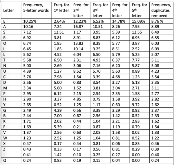 The position of a letter can also be important, since when you get an exact hit it reduces the possibilities considerably. Therefore determining where in the word different letters are likely to fall can also be helpful in choosing your starting words. The results for the 5,197 five-letter words (the last column shows frequencies with duplicate letters removed):