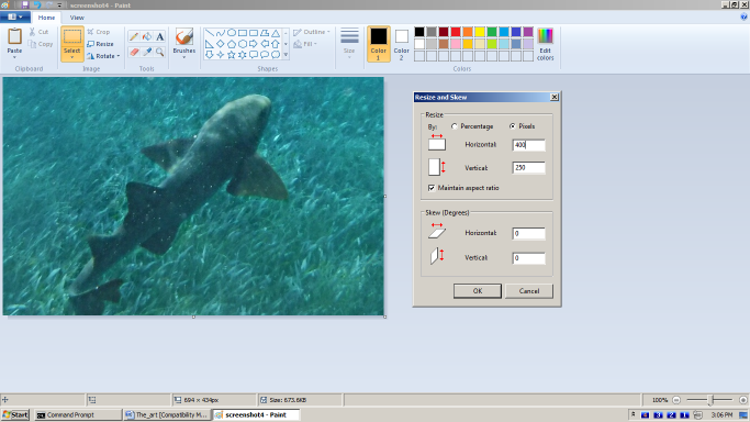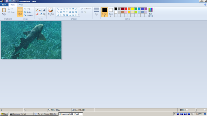 But now the frustrating part: What’s the aspect ratio of the select area? Paint displays the select area’s width and height at the bottom of the screen, in this case 681 and 434. Dividing width by height produces an aspect ratio of 1.57 which is close but not perfect. When dealing with an application as dumb as Paint I would draw and re-draw select areas until I got one that was close to the size and aspect ratio (1.6) I want. Then I would calculate the height and width of an ideal rectangle with the correct aspect ratio.