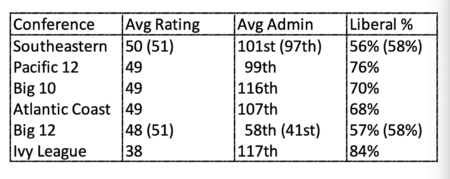 It is interesting to compare how the ratings vary with region of the country. To do this, I used NCAA conferences as a proxy for region (it was easier that way). The average FIRE rating, average ranking of the administration’s policies, and liberal percentage are shown in the following table for the Power 5 NCAA conferences plus the Ivy league, which includes 74 of the 208 universities studied. TCU was not included in the rankings, so they are not included in the Big 12’s numbers. (Unfortunately, Alfred University was not in the rankings, either.) The Admin number is shown as a ranking, rather than an absolute number, out of 203 schools. (Brigham Young, Baylor, Hillsdale, Pepperdine, and Saint Louis University, are not included in the Admin rankings since they were ranked separately due to their having policies that state that they prioritize other values over a commitment to freedom of speech, according to the statement on the FIRE website.)