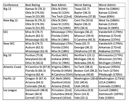 There were definitely variations within a conference. The following table shows the top three and bottom three ratings and admin rankings for schools in each conference, with the Big 12 and SEC shown both before and after the realignment. I have to give a special notice to Iowa State, where I taught for 33 years; I was pleased to see they fare pretty well, relatively speaking, although their absolute rating is only just a little above average.