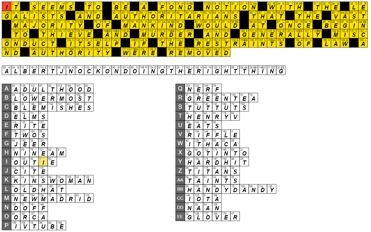 After a long hiatus we’re back, I won’t bore you with all the details but suffice to say that computer issues and a reading drought were the main causes. My plan to learn to code and create my own Acrostic builder/solver lasted as long as most of my other plans (which means I quit about halfway there). I did find some online resources that simplify the creating process and more importantly will generate an online playable version. The bad news is I can’t get it to work on WordPress, so I’ll link to a page on my blog that will be the playable version, for traditionalists below are images that you can print out and play old-school style. You know the drill – Entertainment purposes only…no gambling please, or not… I’m not your sponsor…etc…etc…