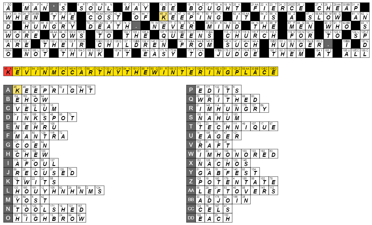Should have mentioned earlier – it took me a while, but I finally got the acrostic solved! Thanks, Teh Hype!