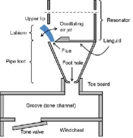 The length of the pipe determines pitch. Width and shape (square, tapered, cylindrical) determine tone. Fine tuning the tone is fiddly and beyond the scope of this article, but comes down to wind pressure, mouth width and height, and the gap between the moth and the languid (the horizontal bar in the image above). Flue pipes may be ‘stopped,’ which is to say ‘plugged.’ Stopped pipes sound at a pitch twice their length; a convenience for longer pipes, possibly affecting the tone.
