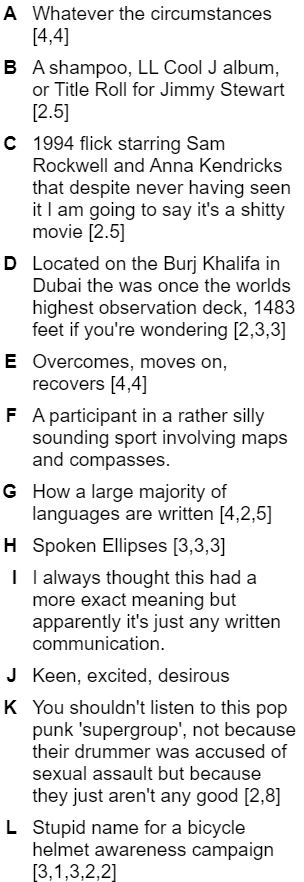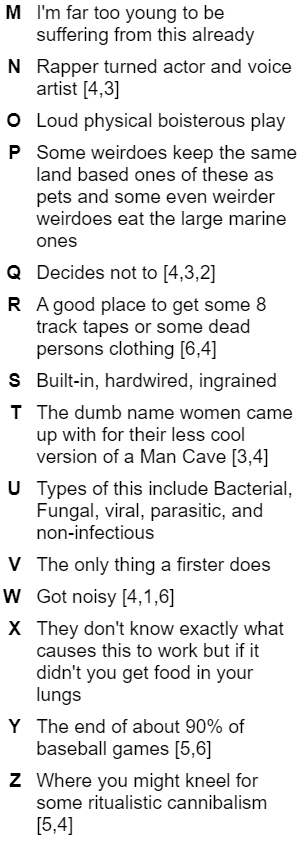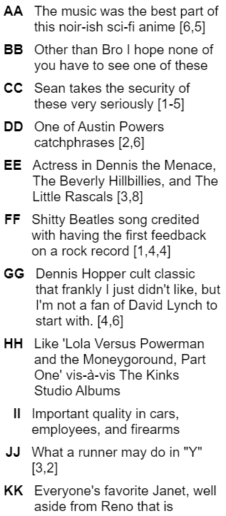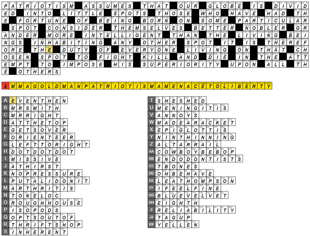 Big puzzle this week, so big the online version may be a little hard to read, on my browser (Chrome) the grid is tiny, I can zoom in but then I have to scroll around between clues and the grid. I hope that this doesn’t hamper your solving experience. Anyway books – I’ve noticed in the WAWR entries and comments that a lot of you re-read novels and series and such. I have never been much of a re-reader, there is always a new book to get to and the few times I have re-read a book I didn’t enjoy it as much as the first time through, perhaps it the knowing what’s going to happen. I guess you could compare it to re-watching TV shows or movies, and while I used to do that the older I get the less I seem inclined to, although I’m watching far less over all so maybe that’s part of it. Anyhow, are you a re-reader, if so what’s the motivation? Work this massive glibcrostic and let us know in the comments…Entertainment purposes only, no gambling please.