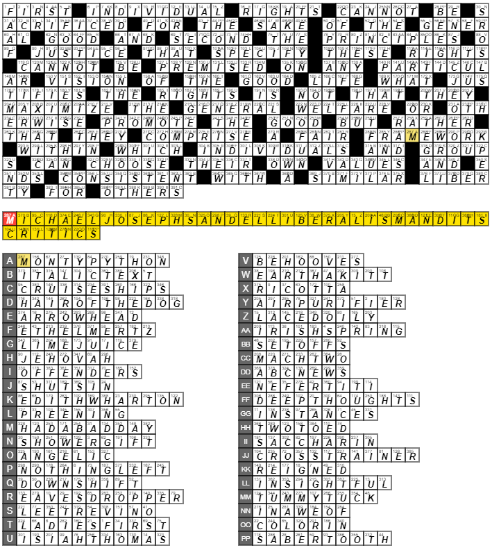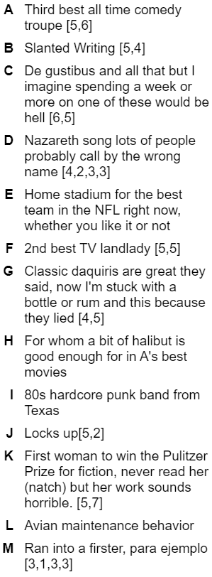 Right, big puzzle this week. I’m drunk and late so Here’s Mojo’s suggestion for books talk – Do you like character driven or plot driven stories, or do you have no idea what the distinction is, try and solve this massive glibcrostic and let us know in the commets.