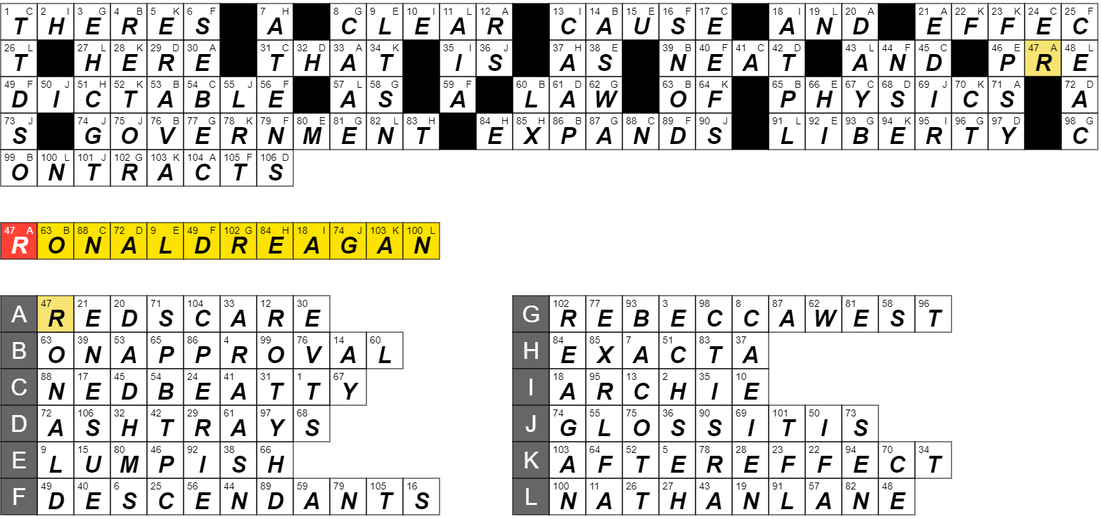Recently I learned that a movie was being made based on one of my favorite novels, I also heard that said movie version was eliminating one of the characters from the book. My initial reaction was “What a bunch of Grade-A bullshit”, but after some reflection I realized only a complete idiot judges a movie one hasn’t seen. I guess I could have justified my initial outrage by claiming that I has heard that some other people weren’t happy with the movie either or that I had read/watched various critical reviews of the film and that they weren’t positive, but In the end I must admit that I was an utter moron for not waiting to see the film before criticizing it. Anyhow work this Glibcrostic and tell us in the comments if you have ever jumped to conclusion about a movie or TV show or novel based on what other people said about it instead of giving it a fair shake.