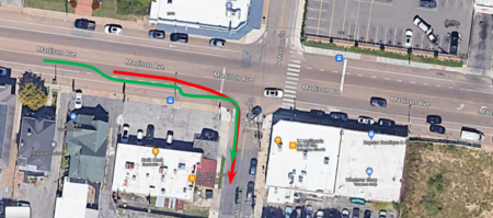 We jumped into the ever-so-easy-to-park 4Runner and rolled eastward, eventually down a formerly useful avenue: Madison. Memphis streets are numbered up until our founders (Andrew Jackson et al) ran out of fingers (seven?). Memphis avenues, except for Poplar (the state tree) and Auction North Parkway, are named for presidents slave holders so that as one rolls south you come forward through the administrations (including innocent Adams the Elder, Esq.) until Monroe, then Union, Beale, and then a listing of states. Madison was once four lanes all the way and carried considerable weight to and fro, but apparatchiki have reduced it for most of its run to two lanes, a turn lane, and, of course, bike lanes, but it was early evening, and we were in no hurry, so the tortuous path did not much offend.