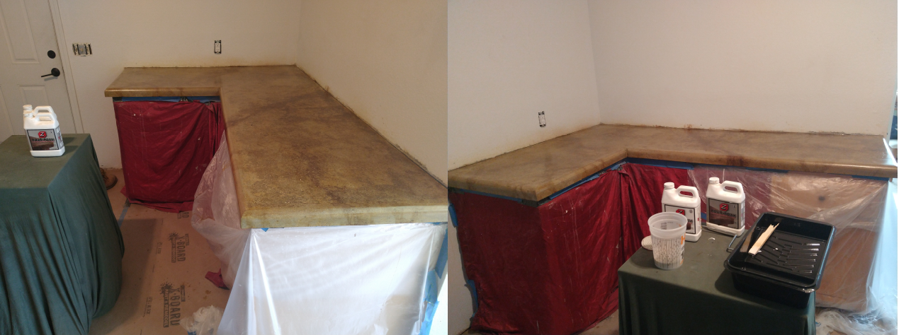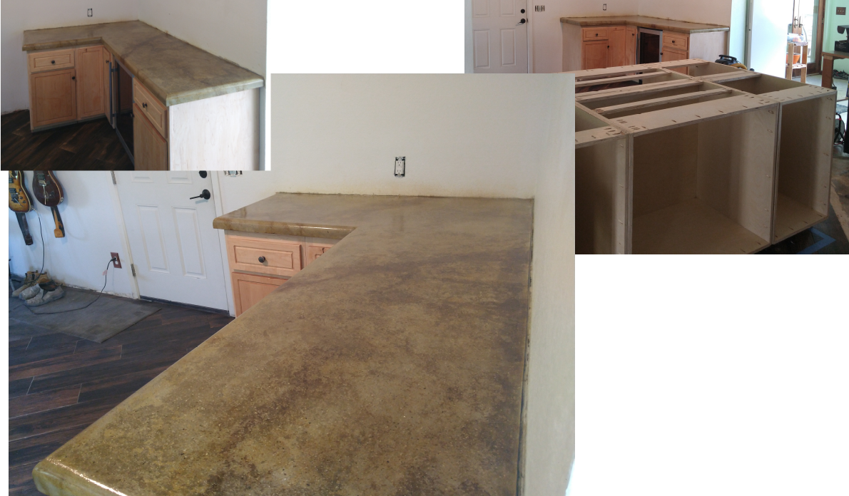 There are lots of concrete stain products our there. I had some stain from Concrete Countertop Solutions left over, so I just used that – this was the Aqua-Tint stain. They have something like 15 colors to choose from; I restricted myself to “Garden” and “Wheat”. It is actually remarkable how much color variation you can get with just these two colors by changing the dilution. For this counter top I used 4 mixes – undiluted wheat for darkest bits, undiluted garden for medium, 3-1 garden and 3-1 wheat for lighter colors. The color will also depend very strongly on the concrete surface and how long you let it sit on the surface and how damp the surface is when you apply it. But you definitely want a pretty damp surface before you apply any stain to allow the stain to flow somewhat naturally rather than sit and absorb deeply – I’d even say I like the results when the water is a bit puddled on the surface, at least away from the sections you want the darker viens to be. This is the artistic portion of the program and I can’t give exact specifics. My approach was to ‘hand paint’ dark veins using the straight wheat; on the edges of the dark veins, I’d add some straight garden and let it sit; it will soak in and make natural looking veins. In between, I’d add the diluted wheat and garden to fill in space; owing to the underlying variation in the concrete, it won’t absorb evenly and you’ll get a mottled appearance. On thing to be sure of is to try and follow your dark veins over the edge, other wise it doesn’t look natural. You also have to take care to work the edges – if you just put the stain on, it will tend to run straight down and look like drips rather than stone structure. So you need to stain at an angle and expand ‘fan like’ to avoid vertical lines. Connect it back to where your dark veins on the surface hit edge and you can a close approximation to natural stone look. Another technique I found to work well is to use a spray bottle with water to spray across the surface at a steep angle, both with a tight stream and more of a ‘mist’. If you maintain a fair amount of water on the surface, this creates a natural flow with color variation owing to the different levels of water dilution. As the water absorbs and evaporates a bit you can also come back with a big sponge and sort of dab here and there to remove dark spots and create a more natural contrast. I strongly recommend you take your test pour and experiment as it’s the only real way to see what techniques work for you to produce the look you are going for. Also note that, during the process, it might not look great, too blended, not enough contrast – you just have to go with it and when it fully absorbs and dries, some of the colors darken, some get a bit ‘brighter’, and you get a good contrast. Unfortunately, I didn’t get any pictures of the staining process, just the end result.