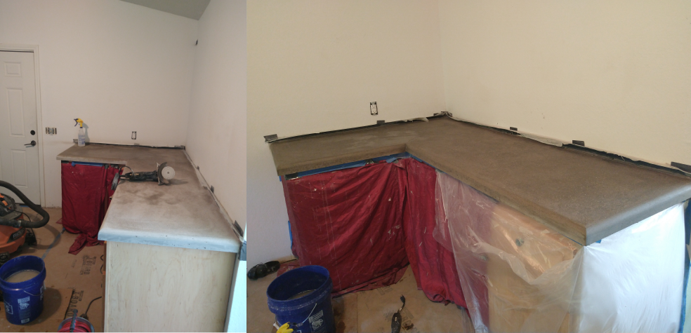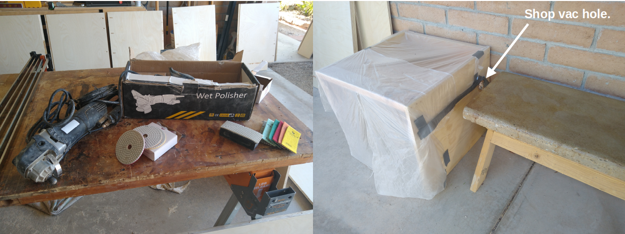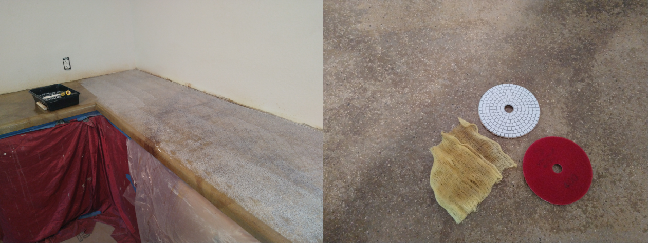 Depending on how smooth/polished a surface you are aiming for – and how careful/successful you were with troweling and vibrating the previous step – you can potentially get off easy here. Since I like very smooth/shiny tops and I screwed up the pour with the over-watered concrete, I had a lot of work to do at this stage. Regardless, this will be a messy step, no matter how much polishing you are going for. This is true for both wet polishing and dry polishing; in the former case lots of “mud” spatter, in the later lots of dust. I did both wet and dry grinding, so ended up with the best mess of both worlds. Since I had a very poor/soft surface from the high water content in my pour, I started with a 50 grit diamond pad alternating with wet and dry grinding using a powered polisher. The polisher has a hose attachment, but I didn’t want to hook that up in the house, so I used a sponge and spray bottle and worked in small sections. I replaced all the ram board on the floor and all the plastic protecting the cabinets for this operation. To try an minimize the dust (dry) and splatter (wet) during this process, I built a little hood covered in plastic. I drilled a hole in the side that would accept a shop vac nozzle and sealed the nozzle in with plumbers putty (easily removable when done). I placed that hood over the section I was working on, stuck my head it and started grinding – actually worked pretty well to keep the mess manageable. Definitely put ear protection on and wear a mask under that hood – the mask actually has a valid function in this situation!