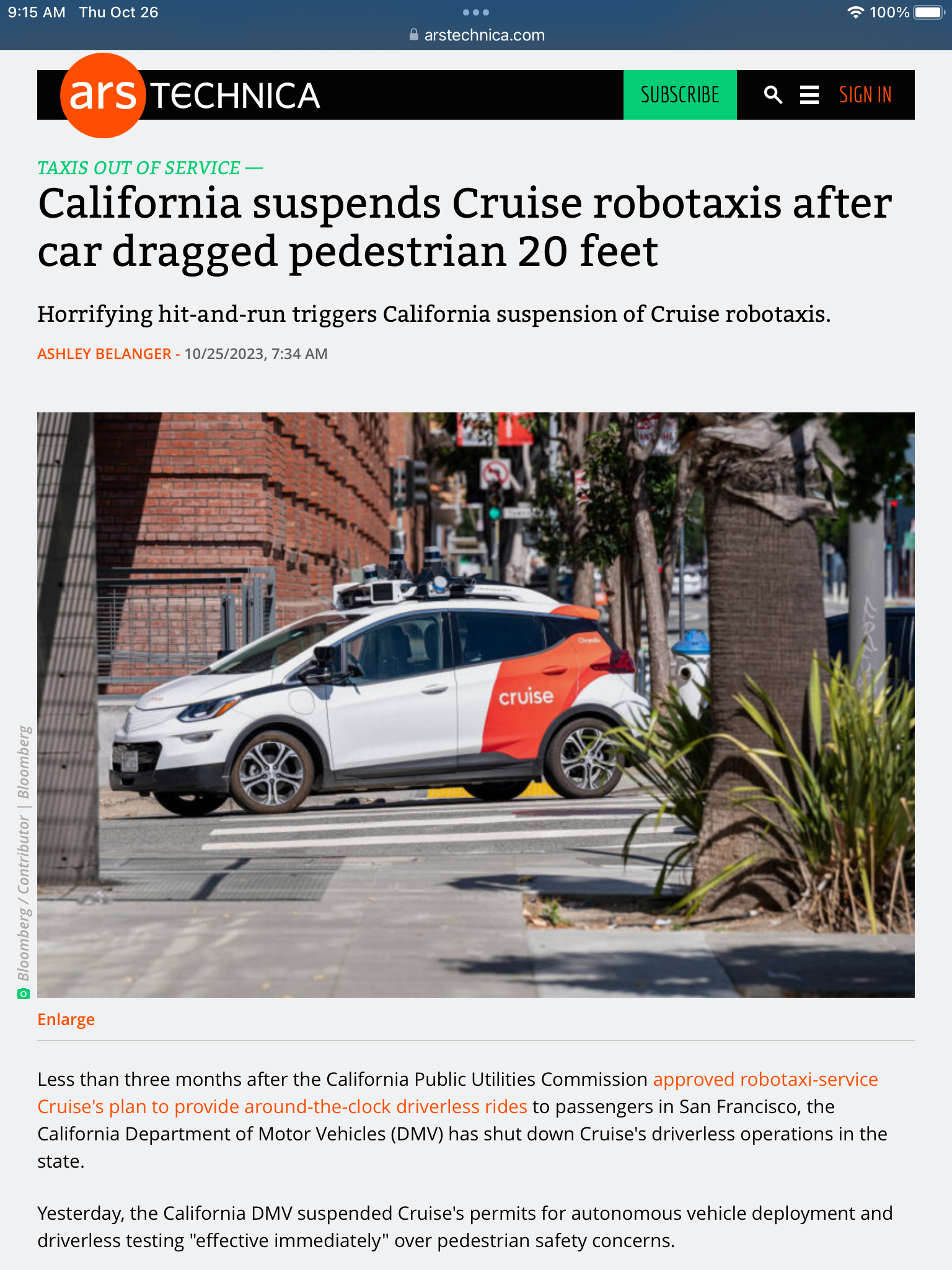 Self-driving cars will never get on the road and stay there because they’ll be held to an almost impossibly high standard. I’m both joyed and saddened by this. I see self-driving cars as an almost irresistable tool that will be used by the surveillance and police state we’ve built. But the risk aversion of our culture is on full display and it’s why we can’t really innovate anymore in ways that matter.