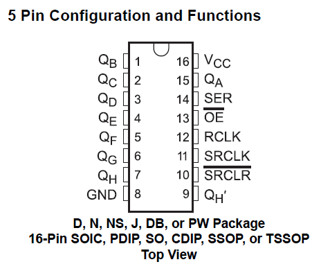 I kept digging into the documentation. There had to be something I was missing. I mean, why have pin nine clone pin seven? Only it wasn’t a clone of pin seven. I didn’t find that detail in the text of anything, but in a timing chart in Texas Instruments’ data sheet on the chip. Pin nine went high a half tick before pin seven. Before? Looking closer at the graph, pin seven was going high on the R-Clock signal as expected. Pin nine was synchronized with the SR-Clock signal, which they had drawn as inverse of the R-Clock. Plus, pin nine was shown as not being impacted my the state of the Output Enable signal. That meant it wasn’t outputting from the storage register the regular output pins were connect to. It had to be outputting bit H of the Shift Register.