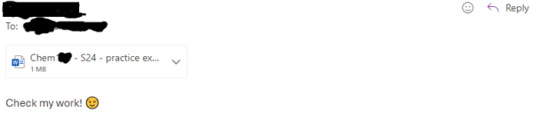 “You used an emoji in your email to her.” (That’s a screenshot of the offending missive, the key for my practice exam which she had requested)