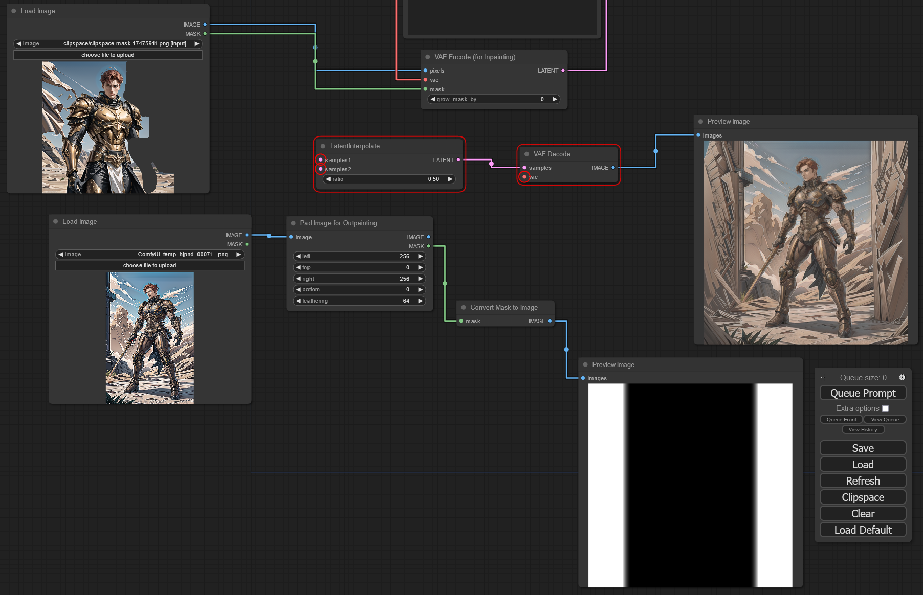 But I do notice that the original image is getting pretty fuzzy at this point. We have to clean this up. We’re going to resample again. For this we don’t need the mask from the padding nodes, so we’ll disconnect that and replace the mask with the output from the top load node, switching to our most recent unwonky but fuzzy image. Now we’re going to pull in a node that was hiding in an earlier workflow. “Latent Interpolate” takes two latent inputs and outputs a merged latent at a ratio as defined in the node’s only option. I have this set to 0.5, and feed it the latent from the VAE encode. But it takes two latents. Well, we’re going to feed it a blank latent from the empty latent image node that’s been hanging around unused.