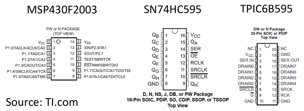 While KiCAD had built-in symbols for my common Texas Instruments chips, my pet peeve is that the schematic diagram does not resemble the physical pinout. My brain wants to associate to the physical chip I’m looking at. Here’s the pinouts from the datasheets for the three chips I used: