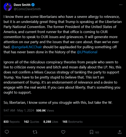 Ever since their play to take control of the LP, the Mises Caucus has faced accusations of being rabid Trump supporters intent on turning the LP into a pro-Trump auxiliary. I never found the accusation very credible personally, but I must admit, the optics are terrible. When your enemies are accusing you of being shills for Trump, you invite the Donster to your convention!? Even worse if Biden doesn’t show, those low info LP members who were unaware of the Biden invite are going to think only Trump and RFK were invited, validating the accusations of a far-right coup, orchestrated by the caucus.