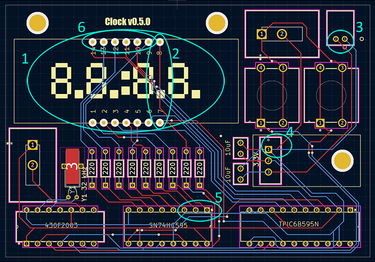 As a quick overview, the six errors in the board design are in these spots: