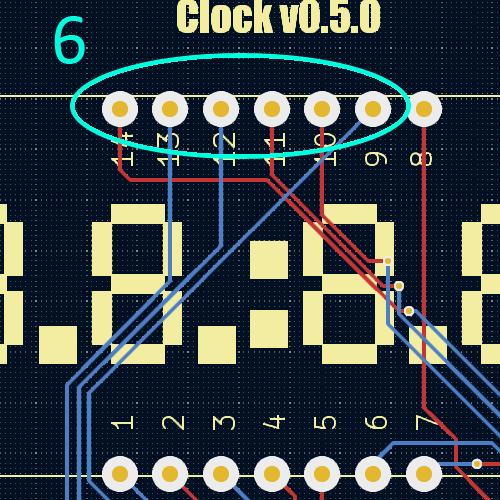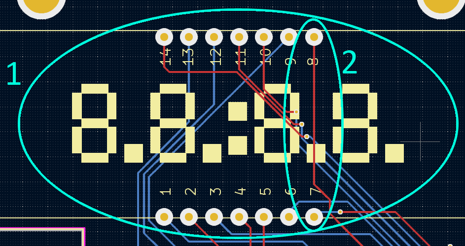 Both come from the same mistake. The four digit seven segment display I used did not have a premade footprint for KiCAD, so I figured I’d create the connections for it by placing Vias for the posts to get soldered into. This plan wasn’t bad on its own, but I missed some details when setting it up. The first was easy to make. By default, KiCAD has solder masks over the vias as they are intended to connect traces on different layers of the board. Since I didn’t remove that from the design, the board arrived with solder mask over the copper where I’d intended to solder. The fix was straightforward, I ended up scraping the mask of with an X-acto knife.