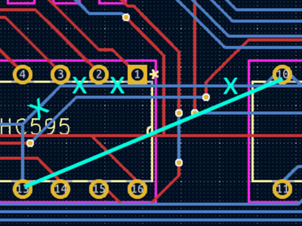I did not intend to attach them to that trace, but it got too close, and all three shorted to it. What is that trace? The ground plane. Pins 1, 2, and 3 are data lines controlling the bottom three segments of the seven segment display, so if they’re all shorted to ground, half of the display will never light up. Now this diagram is zoomed way in. Bear in mind that the space between pins on this board in 0.1″ (2.54mm), so that second trace below the ground plane was awfully close. What is that trace? It’s the serial line providing data to the second shift register, controlling which digit of the display is being controlled. If I broke that, the entire display would go dark. I had no choice but to break up the ground plane trace, and avoid damaging the serial data line adjacent. This led to a lot of careful picking away with the tip of an X-acto knife, and running another bodge wire between Pin 10 on one shift register to Pin 13 on the other to repair the ground plane. Ultimately, the changes looked like this:
