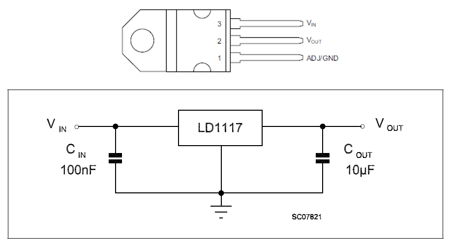 Vin is the 4.7v from the battery, it goes into Pin 3, but has a ten microFarad capacitor connecting it to ground. The Vout is the 3.3v going to the rest of the decide and comes from Pin 2. It also has a 10 microFarad capacitor connecting it to ground. Ground gets connected to Pin 1.