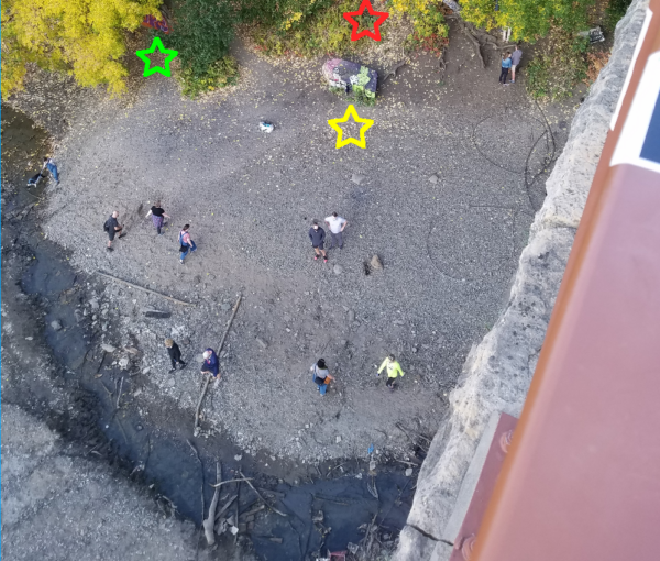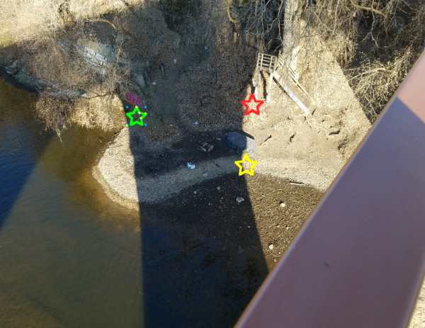 These next two shots are of the same place, but taken from atop the bridge. I put stars near a couple of landmarks to help you understand how much the water had come up. The green and yellow stars are a couple of big rocks that have been down there forever. The red star is the base of some stairs that you can take from the top of the bluff down to the river. (I am honestly surprised that the stairs didn’t collapse. They are in horrible disrepair and are supposed to be closed).
