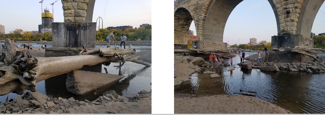 These two pics are from the other side of the bridge (downstream). The pile you see is an old pier from an old iron truss bridge that used to be there. In the pics you can see how much erosion took place from the water. I guess dropping bridges into the Mighty Mississippi has been a long been a favorite past time of the citizens of Minneapolis.